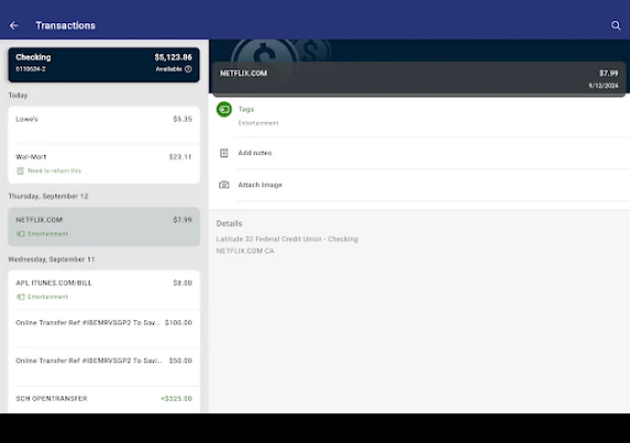Here’s what you can do with Latitude 32 CU: -Keep your transactions organized by allowing you to add tags, notes and photos of receipts and checks. -Set up alerts so you know when your balance drops below a certain amount -Deposit checks in a snap by taking a picture of the front and back -Find branches and ATMs near you